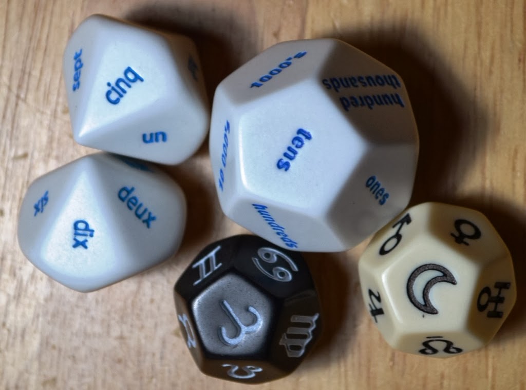 I like weird dice. So I bought a few I didn't have. But those two on the left. How strange, they are in French. I don't read French. It would probably kill me. Hmm, who do I know that could use them?