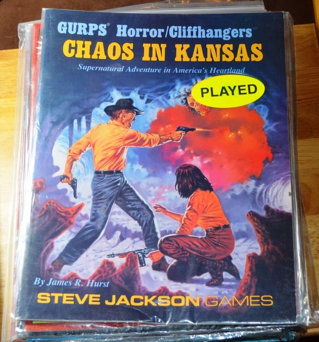 An addition to my GURPS collection. I'm always looking for books I'm missing. This was one. Just a word of advice to those two folks. If you have two pistols and a machine gun, ALL of them should be pointed at the scary red cloud skull thing.