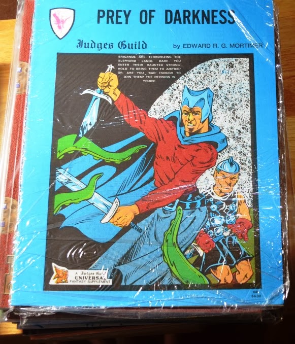 And last, but not least, another Judges Guild offering. This one has been on every bargain bin pile I've seen. I finally decided to grab a copy because I don't have one. Conan like man taking center stage, his buddy keeps telling him to make a big muscle and purple mage guy is making scarey hands.